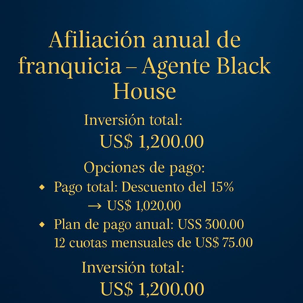 Este sistema de inversión flexible permite al agente franquiciado elegir entre pago único anual con descuento o cuotas mensuales fijas, facilitando el acceso a una oportunidad empresarial escalable, con respaldo institucional y visión global.