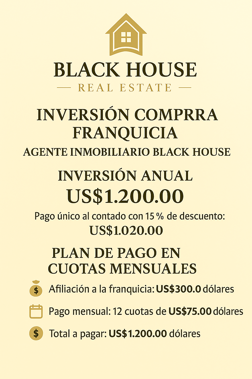 Únete a una red diseñada para transformar tu potencial en resultados reales. En Black House Real Estate no solo adquieres una marca, sino una plataforma integral de crecimiento que combina formación constante, herramientas tecnológicas avanzadas y una comunidad global de agentes con visión empresarial.